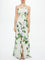 The Avory dress in our exclusive Peonia print in white and lush green has a cross tie back, an open front, and a full length flowing skirt. This dress features a vibrant lush floral print, a delicately designed cross tie back, an alluring open front, and a sweeping full length flowing skirt. Let the light sheer fabric drape over your skin as you dance the night away in this exquisite piece. Indulge in true luxury with the Avory Dress.
