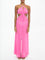 The Avory dress is luscious pink has a cross tie back, an open front, and a full length flowing skirt. This dress features a vibrant lush pink hue, a delicately designed cross tie back, an alluring open front, and a sweeping full length flowing skirt. Let the light sheer fabric drape over your skin as you dance the night away in this exquisite piece. Indulge in true luxury with the Avory Pink Dress.