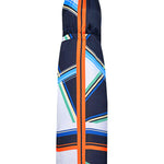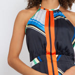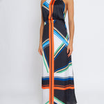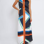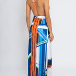 With her dramatic lengthening lines, cinched waist, and floor gazing hem, Brenda is a figure flattering and eye catching maxi dress in graphic black, blues, orange, green, and white. Self-tie halter and a low open back, Brenda bridges day to night for a beach to bash look with sophisticated sex appeal.