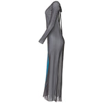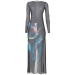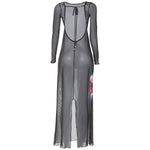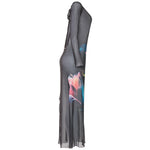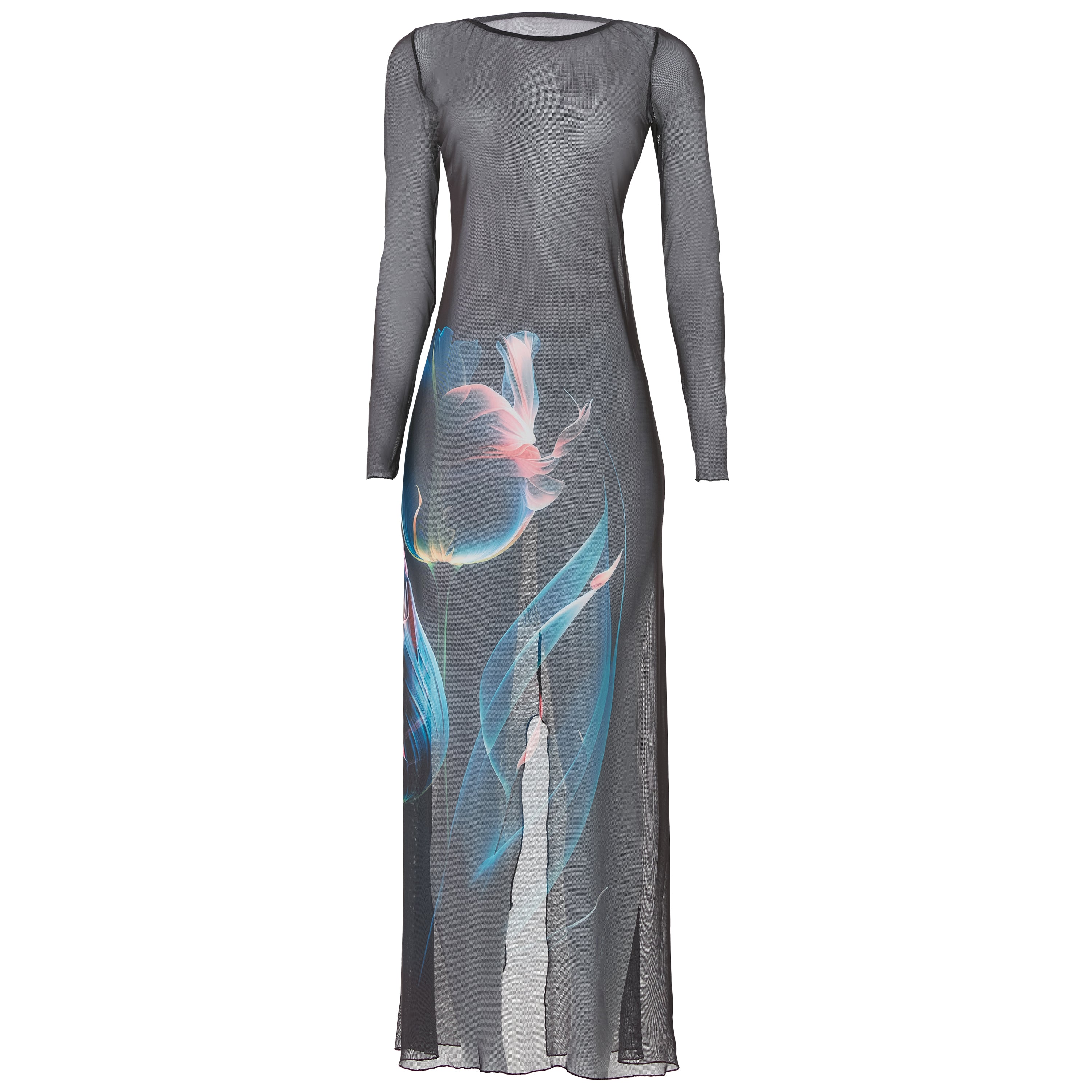 Experience ultimate style and sophistication with the Carmen Tule Dress. Its sheer fabric, crafted in elegant black tule, features an exquisite engineered printed iridescent tulip design from hem to waist, enhancing your natural curves with every step. Elevate your wardrobe and make a statement with this exclusive dress.