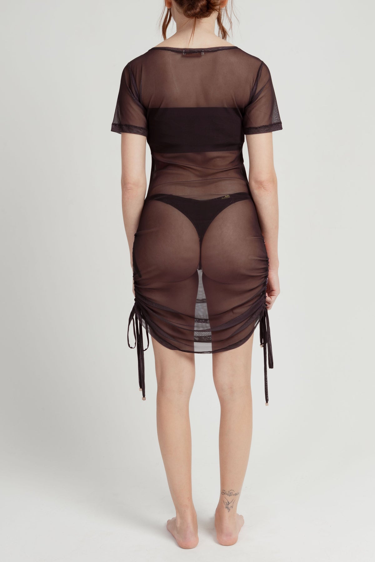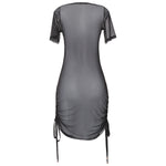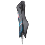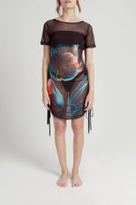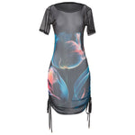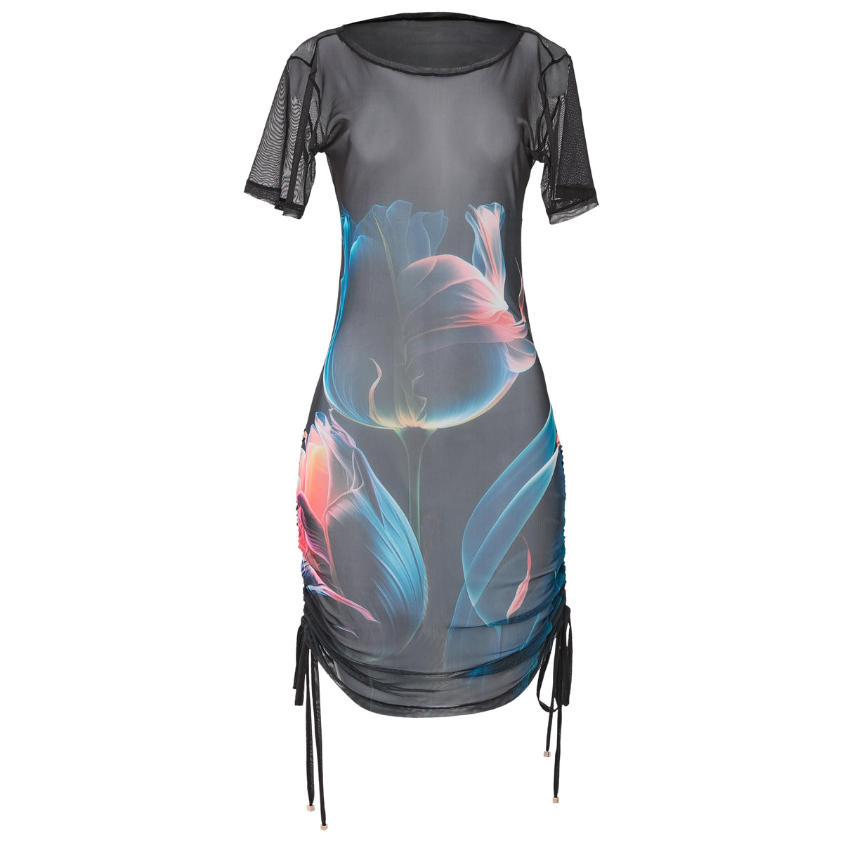 Experience ultimate style and sophistication with the Leila Tule mini Dress. Its sheer fabric, crafted in elegant black tule, features an exquisite engineered printed iridescent tulip design from hem to bust, enhancing your natural curves with every step. Elevate your wardrobe and make a statement with this exclusive dress.