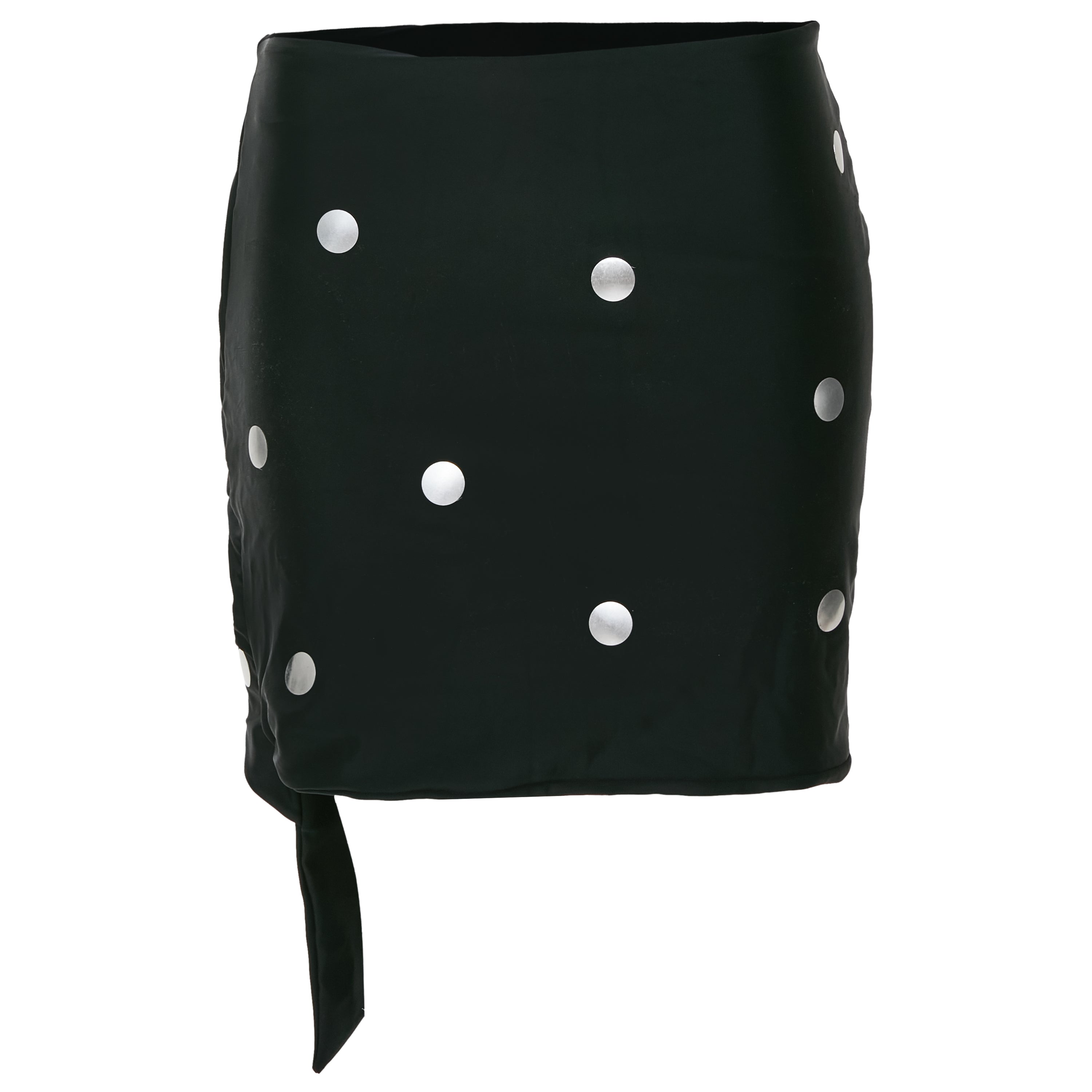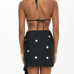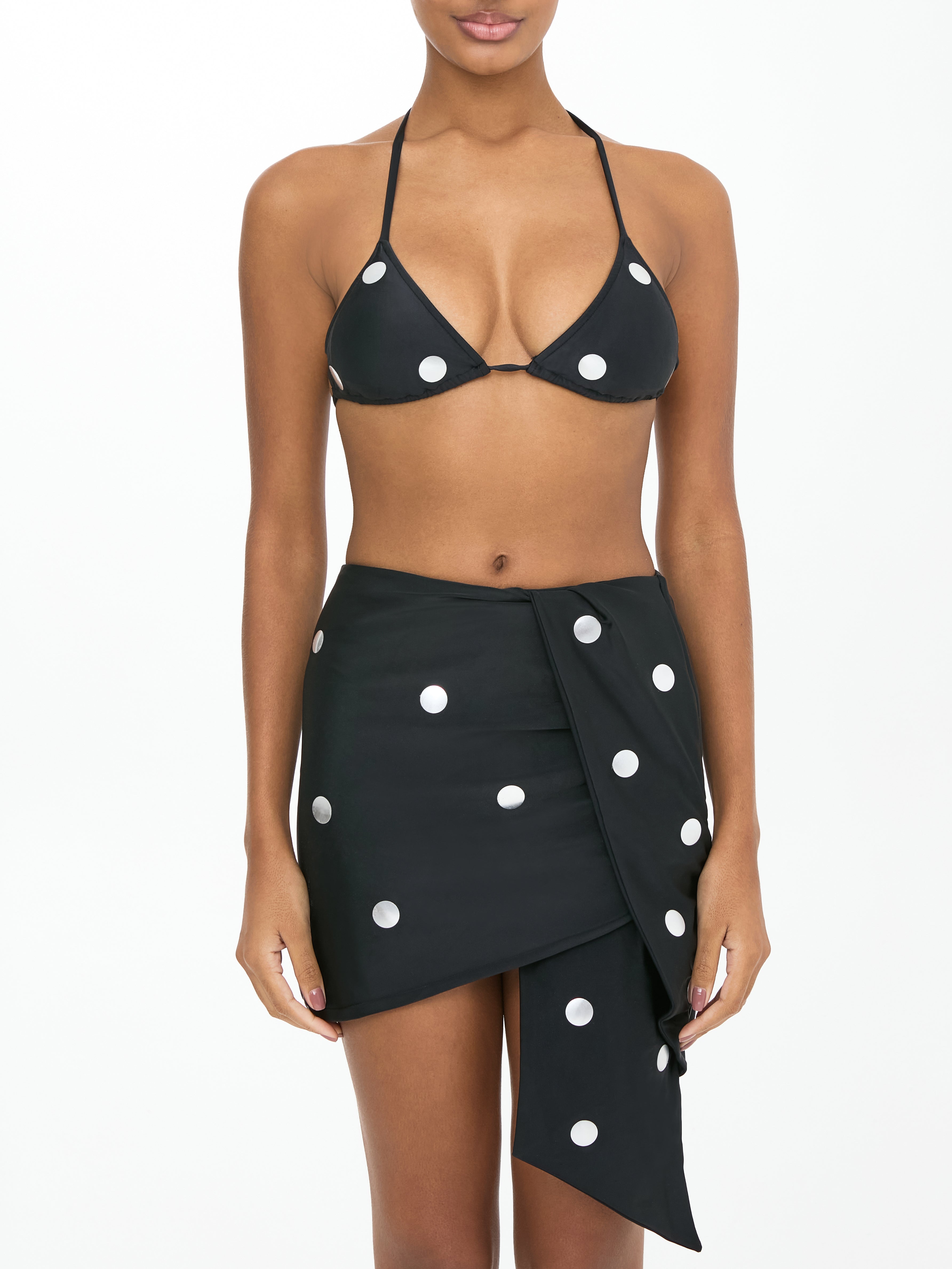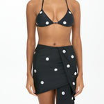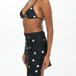 Suzane wrap style mini skirt is black with silver foil polka dots is playful and sexy. It's a versatile skirt that embodies sophistication with a playful twist. The wrap style and silver foil polka dots add an element of flirtiness to your wardrobe, making it perfect for casual days and nights at the seaside.