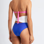 Talk about a showstopper! This one piece is bound to rack up the complements. The Sakura pink, off-white and blue color blocks. The top and middle sections feature adjustable ties that allow the suit to fit perfectly to your body, while adding a unique wrap-look.