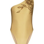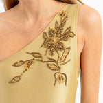 Sinesia Karol's one-piece swimsuit Duna showcases beautiful beaded floral embroidery and a one-shoulder silhouette.