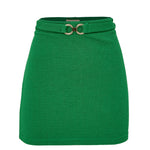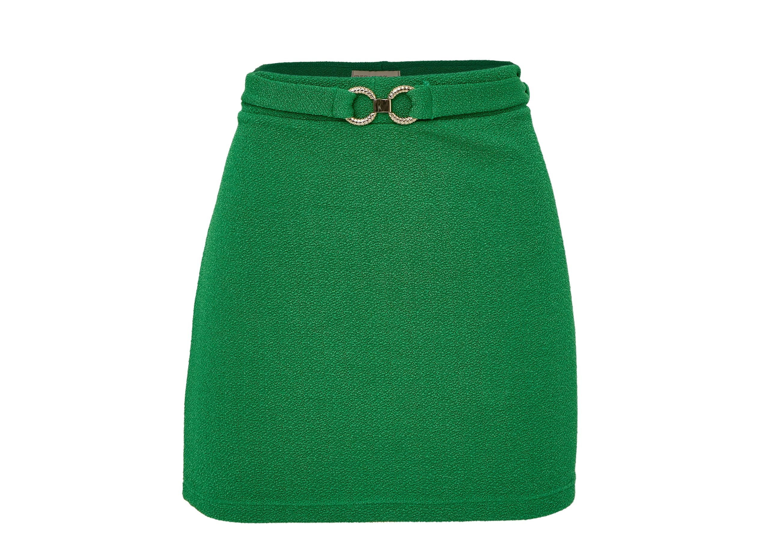 Elevate your wardrobe with the opulent textured dobby weave of the Fiorela Skirt in an on-trend fresh spring green hue. The mini cut is both sophisticated and sexy with self color belt and silver hardware adding a touch of elegance.