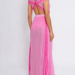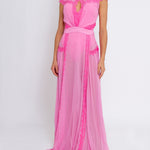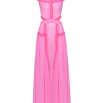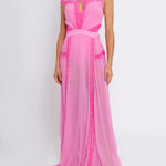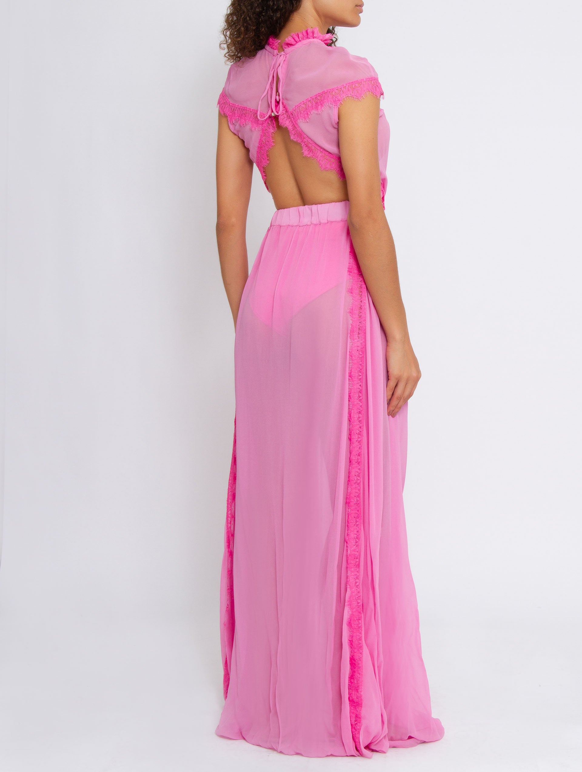 The Lucile Sakura Dress is a stunning confection in 100% silk chiffon. Sheer playful elegance from the high neck ruffle collar to the sweeping floor puddling hem. Bright pink accent lace limns the keyhole front opening and highlights the delicacy of the form. Cap sleeves, open back.