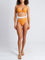Alani bikini bottom in textured dobby luxury fabric of citrusy Satsuma orange with asymmetrical white Lotus highwaist accent. Make a sunny splash with Alani beach, cruise, or poolside. Pair with Alani Top