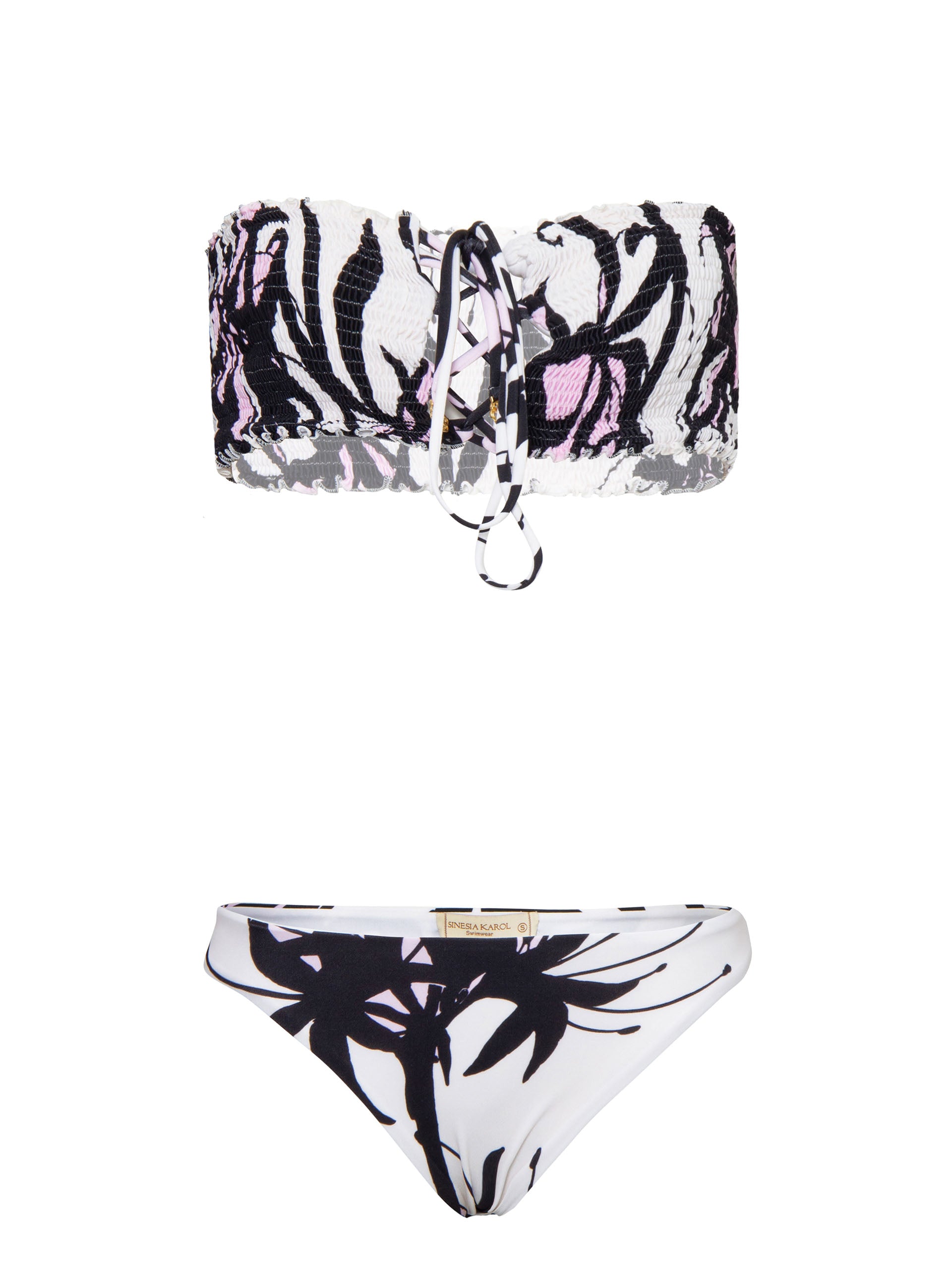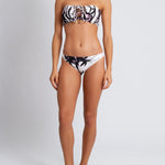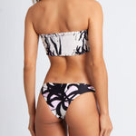 The Faith top is a ruched bandeau lace tie front bikini in our Flor Ink print, a dramatic sumi-ink inspired floral, printed on Lotus white stretch-polyamide lux fabric in black with soft pink accents. Pair with Faith Flor Ink Bottom. Also available in Sakura