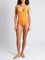 Kyra one piece in a textured dobby luxury fabric of citrusy Satsuma orange. Kyra features a white lucite thistle medallion strap detail, generous v neckline, and delicate straps crossing a scoop back. Take this youthful maillot on your next getaway!