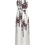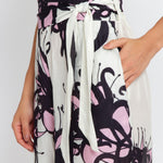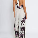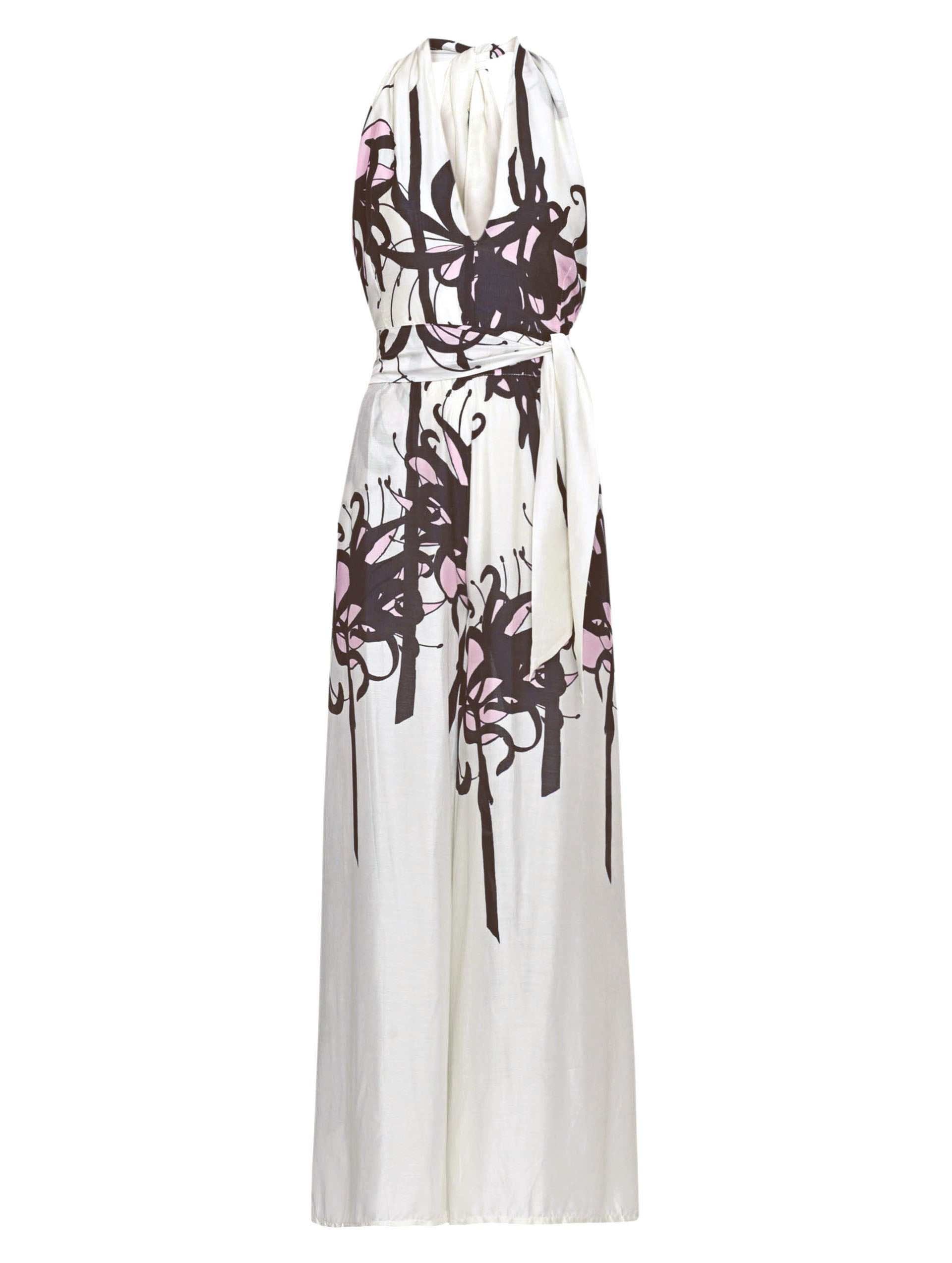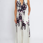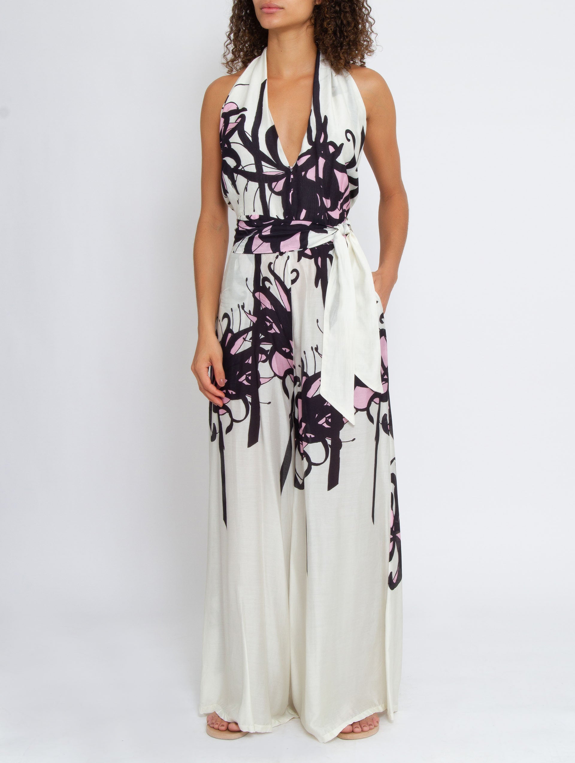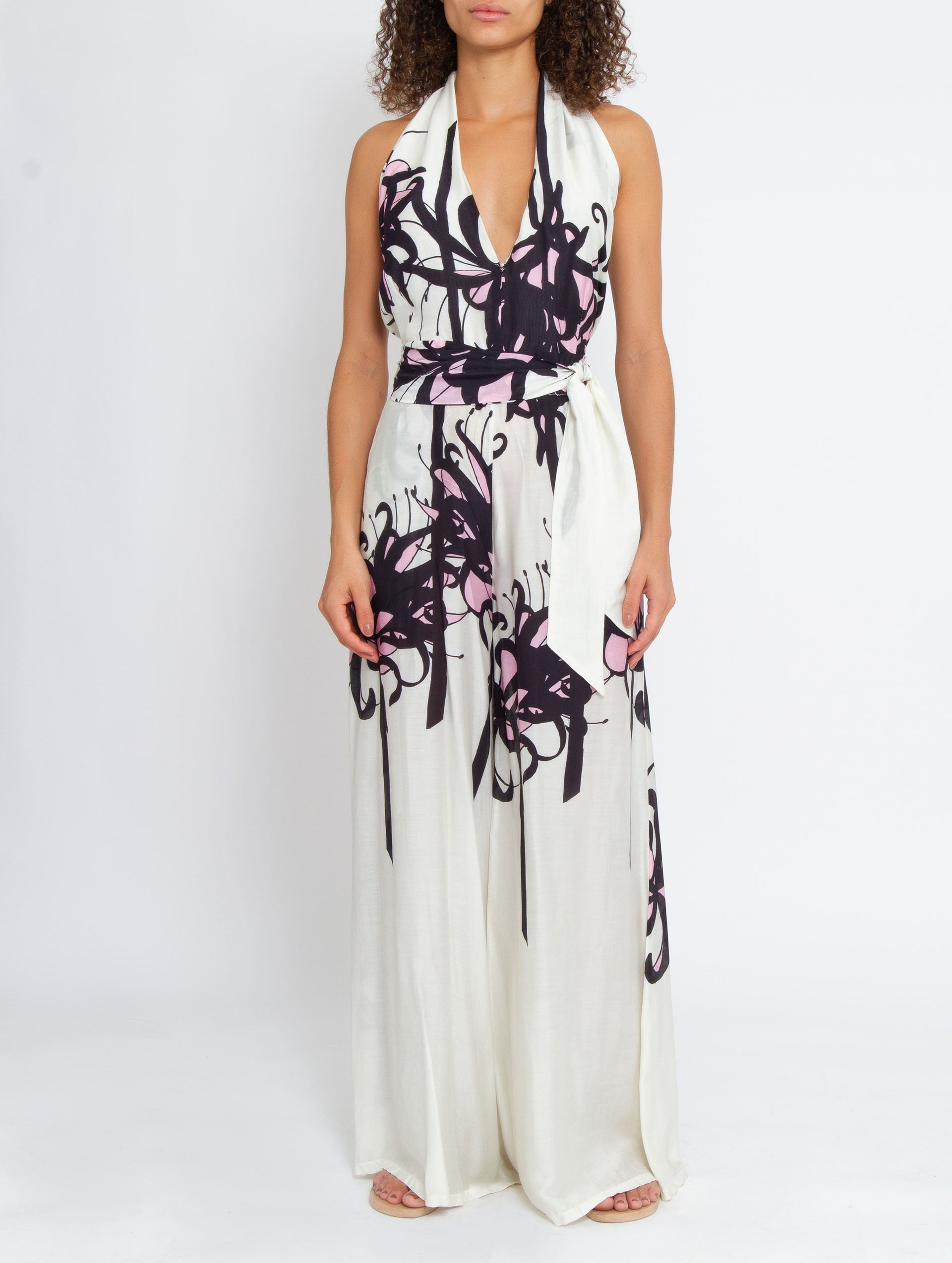 Mia is an elegant jumpsuit in our stunning Flor Ink seasonal print of black and sakura pink on a sheer white silk viscose blend. Make a head-to-toe statement in floor length Mia with a halter tie neck, plunge neckline, and on seam pockets. Self-tie extra long waist for added panache.