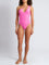 Vida one piece in reptilian textured pink Sakura lux swimwear fabric. Vida combines thick and thin straps onto one shoulder, v neckline, and a high cut leg opening.