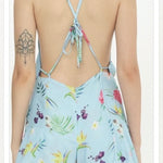 Experience the ultimate in playful elegance with the Elis Blue Garden Romper. Let loose and reveal some skin with a surprising backless design, all while feeling perfectly refined with the halter tie neck and short length. Indulge in luxury with every wear.