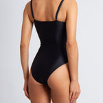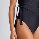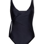 Kara one piece in Obsidian black stretch-polyamide lux swimwear fabric. Kara features a wrap style with a generous side tie, a low v-neck, a high back, and high cut leg openings. Elegant and confident, Kara is The Little Black Dress of your swim wardrobe. Also available in Satsuma.