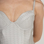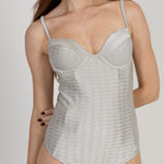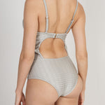 Experience ultimate glamour and sophistication with the Laís One Piece Silver swimsuit. The chevron jacquard design in a structured bustier style exudes pure luxury. With a low cut leg and full coverage bottom, it's both stylish and flirty leaving lots to the imagination. The elegant clasp closure in the back adds the finishing touch to this exclusive swimsuit.