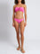 The Faith top is a full coverage ruched bandeau lace tie front bikini in reptilian textured pink Sakura lux swimwear fabric. Featuring gold SK logo charms at front tie closure. Pair with Faith Sakura Bottom. Also available in Flor Ink.